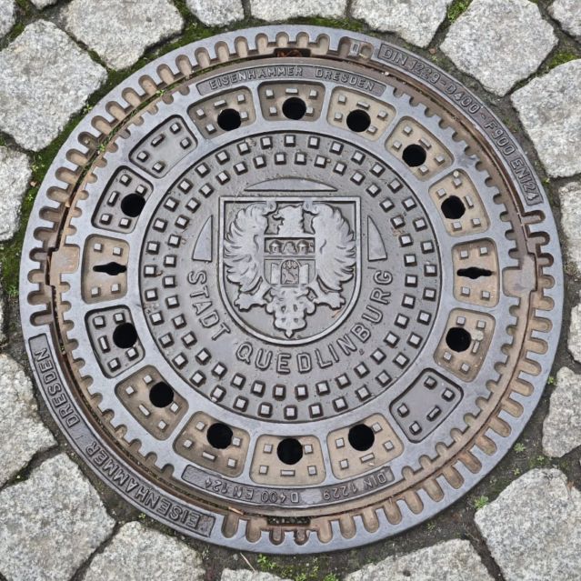 Der Kanaldeckel zeigt das Stadtsiegel, eine gezinnte Stadtmauer mit drei Toren und drei von vier Sternen begleiteten Türmen; auf den äußeren Türmen steht je ein das Harsthorn blasender Wächter, unter dem mittleren Tor befindet sich eine Lilie. Das Siegel geht auf das erste Stadtsiegel von 1218) zurück und gehört somit zu den ältesten bekannten Stadtsiegeln. Das Stadtwappen zeigt in Silber ein rotes Kreuz, dem Attribut des ältesten Stadtpatrons, dem heiligen Georg.
